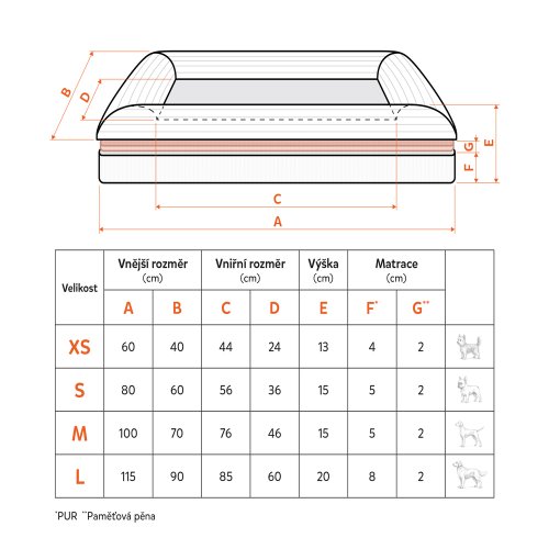 Jádro pelechu tvoří 5 cm vysoká polyuretanová pěna (PUR) o hustotě 25D, která slouží jako pevná a odolná základna. Na ní leží 2 cm paměťové pěny o hustotě 40D, která se přizpůsobí tvaru těla psa, rovnoměrně rozloží tlak a uleví kloubům i páteři. Celková výška matrace je 7 cm, což zajišťuje pohodlí bez přehnaného propadání a současně usnadňuje pohyb v pelíšku. Bočnice vysoké 15 cm tvoří přirozenou oporu hlavy a zároveň pomáhají vytvořit chráněný a útulný prostor. Pes se tak může snadno uvolnit a nerušeně odpočívat, bez stresu a vyrušení.