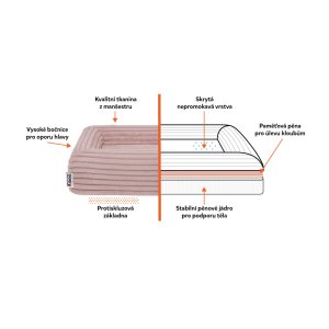 Jádro pelechu tvoří 4 cm vysoká polyuretanová pěna (PUR) o hustotě 25D, která slouží jako pevná a odolná základna. Na ní leží 2 cm paměťové pěny o hustotě 40D, která se přizpůsobí tvaru těla psa, rovnoměrně rozloží tlak a uleví kloubům i páteři. Celková výška matrace je 6 cm, což zajišťuje pohodlí bez přehnaného propadání a současně usnadňuje pohyb v pelíšku. Bočnice vysoké 13 cm tvoří přirozenou oporu hlavy a zároveň pomáhají vytvořit chráněný a útulný prostor. Pes se tak může snadno uvolnit a nerušeně odpočívat, bez stresu a vyrušení.