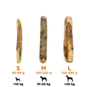 Žvýkací tyčinky z olivového dřeva jsou k dispozici v různých velikostech pro různá plemena a hmotnost psů. Životnost tyčinky se pohybuje od 3 do 6 měsíců v závislosti na žvýkacích aktivitách psa.
