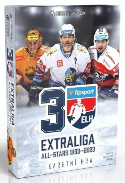 Oficiálně licencováno. Česká Extraliga ledního hokeje oslavila v sezóně 2022/2023 třicáté výročí své existence. Během té doby jsme mohli sledovat stovky hráčů. Někteří upadli v zapomnění, jiní oblékali reprezentační dres, nebo se proslavili v NHL. Ti výjimeční se stali klubovými legendami. Karetní hra Extraliga All-Stars vám umožní sestavit si svůj vlastní tým snů a zahrát si zápasy proti živým protihráčům i „virtuálním“ soupeřům. Ve hře najdete všechny týmy ze sezóny 2022/2023 a jako bonus také týmy, které v třicetileté historii vyhrály extraligový titul. Každý tým je reprezentovaný šesticí hokejistů z celé samostatné extraligové historie, kteří byli vybráni ve spolupráci s jednotlivými hokejovými kluby. Ve hře pak najdete i největší osobnosti československého hokeje ve formě karet legend bez klubové příslušnosti. Je jen na vás, jak bude vypadat váš tým a jestli ho dokážete dovést až k titulu. Hra je určena pro 2-5 hráčů od 8 let a zabere vám zhruba 30 minut. Je rozdělena do dvou hlavních fází.1. DRAFTNapadá vás lepší herní mechanika pro hokejovou hru s tvorbou týmu? U karetních her draft probíhá standardně tak, že hráči dostanou do ruky určitý počet karet, jednu si vyberou a zbylé karty předají dalšímu hráči. V naší hře se draftují karty hokejistů. Je jich celkem 110 a vaším cílem je, abyste si nadraftovali hokejisty na správné pozice (LK, C, PK, O, O, B) a nejlépe i získali více hráčů z konkrétních klubů. Po 2 kolech draftu, během kterých získáte 12 karet hokejistů, si vytvoříte základní sestavu pro první kolo druhé části hry.2. SEZÓNAHlavní část hry, ve které se svým týmem zabojujete o vítězství. Sezóna se skládá z několika kol, během kterých se se svým týmem utkáte v zápasech proti ostatním hráčům i “virtuálním” soupeřům. Před zápasy se odhalují karty událostí, které ovlivňují všechny hráče během právě probíhajícího kola. Samotní hráči mohou průběh hry změnit trenérskými kartami, ale mají jen 3 na celou sezónu, takže je potřeba jejich použití dobře zvážit. Zápasy se vyhodnocují hody kostkami, ale samozřejmě je za tím ukryto několik zajímavých mechanik a pravidlových twistů. Po každém zápase pak dojde k vynucenému i dobrovolnému střídání hráčů, takže si nemyslete, že stačí nadraftovat silnou základní sestavu a máte vyhráno.Karty hokejistů:Ve hře najdete 6 karet hokejistů (centr, levé křídlo, pravé křídlo, 2 obránci, brankář) z každého ze 14 klubů, které odehrály extraligovou sezónu 2022/2023 + 3 dalších týmů, které ve třicetileté historii Extraligy získaly titul a navíc 8 karet legend předextraligové éry. Na kartách najdete pozici hráče, klubovou příslušnost, kolik let strávil v Extralize v daném klubu a kolik s ním získal titulů. Dva hráči z každého klubu maní navíc přiřazenou speciální schopnost, díky které mohou během zápasů manipulovat s kostkami. Obsah balení: 110 karet hokejistů, 17 karet soupeřů, 5 karet losu, 20 karet událostí, 18 trenérských karet, 1 žeton prvního hráče, 30 žetonů síly týmu, 5 bodovacích žetonů, 12 šestistěnných kostek, 1 bodovací tabulka, 1 pravidla hry