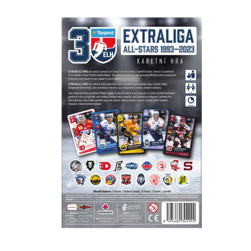 Karetní hra, která vás provede historií české nejvyšší hokejové soutěže.OFICIÁLNÍ LICENCOVANÝ PRODUKTČeská Extraliga ledního hokeje oslavila v sezóně 2022/2023 třicáté výročí své existence. Během té doby jsme mohli sledovat stovky hráčů. Někteří upadli v zapomnění, jiní oblékali reprezentační dres, nebo se proslavili v NHL. V naší hře se draftují karty hokejistů. Je jich celkem 110 a vaším cílem je, abyste si nadraftovali hokejisty na správné pozice (LK, C, PK, O, O, B) a nejlépe i získali více hráčů z konkrétních. Fandíme na mistrovství!