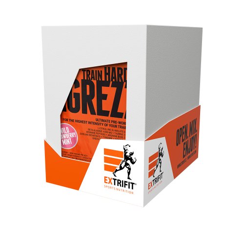 Celkem 8 850 mg pumpovacích látek: citrulin DL-malát, arginin a prémiová složka PepForm® Arginine Peptides – mimořádně silný arginin v peptidové formě! Jedná se o unikátní složku, kterou používají jen ty nejdražší a nejlepší produkty na trhu! Aminokyselina beta-alanin v ohromné dávce 4 000 mg pro maximální výdrž svalů. Aminokyselina tyrosin v dávce 1 000 mg pro dosažení optimálního fyzického a mentálního výkonu. Kofein, taurin a extrakt zeleného čaje podpoří soustředění na výkon, nakopnou a oddálí pocit únavy. Vy tak budete moct efektivně trénovat po delší dobu než normálně! Inosin: moderní předtréninková látka, kterou najdete jen v těch nejpokročilejších produktech. Piperin (extrakt z pepře): velmi ceněná látka s řadou pozitivních účinků na zdraví – podporuje imunitu, činnost jater, krevní oběh v malých cévách a maximalizuje účinky ostatních látek v produktu. Cholin a synefrin (extrakt z pomerančovníku) přispívají k využití tuků v energetickém metabolismu. Na své si tak přijdou i sportovci v rýsovací fázi a ti, kteří si hlídají tělesnou hmotnost. Extra silný pre-workout vhodný i do diety Velkou výhodou produktu je nulový obsah sacharidů a tuku. Produkt je tak vhodný i pro sportovce ve fázi rýsování. Navíc díky účinným látkám, jako jsou zelený čaj, piperin nebo cholin, podporuje AGREZZ® efektivní metabolismus tuků. Tento produkt je určen pro náročné sportovce. Zažijete novou dimenzi tréninku! Je to skutečně silný produkt, dodržujte tedy doporučené dávkování a neužívejte jej krátce před spánkem. Je tak silný, že jeho účinek by mohl přetrvávat i v době, kdy již potřebujete regenerovat. Dokonalá chuť v praktickém balení Většina pre-workoutů nechutná dobře, to ale není případ produktu AGREZZ®! Díky mnohaletým zkušenostem s ochucováním suplementů jsme všechny příchutě vyladili k absolutní dokonalosti. Vzhledem k vysokému obsahu a typu účinných látek se tak jedná o naprostý unikát! A abyste nemuseli odsypávat prášek z velkého balení, Extrifit® pro Vás připravil produkt v sáčcích, ve kterých je dávka naprosto přesně odměřena. Sáček je malý, praktický a můžete jej vzít s sebou kamkoliv. V případě potřeby stačí rozpustit ve vodě a nápoj je hotov!