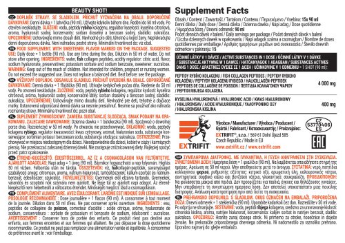 1× denně kdykoli. Hodí se ráno, do práce, po tréninku i večer. Pro jemnější chuť nařeď do 50 ml vody. Pro koho Ideální pro ženy i muže. Od běžného dne v kanceláři až po soutěžní scénu. Zkrátka pro každého, kdo chce péči o vzhled řešit rychle, snadno a chutně. Shoty EXTRIFIT® – česká výroba Naše shoty vyrábíme pod jednou střechou v Dolním Újezdě: vlastní vývoj, vlastní technologie, naše odpovědnost za každý mililitr. Celý proces držíme pevně v rukou – od výběru těch nejlepších surovin, přes testování a míchání, až po balení a expedici. Každou šarži si hlídáme sami. Žádné anonymní fabriky, žádný outsourcing. Jen precizní výroba a výsledek, na který se můžeš spolehnout. Doporučené dávkování: