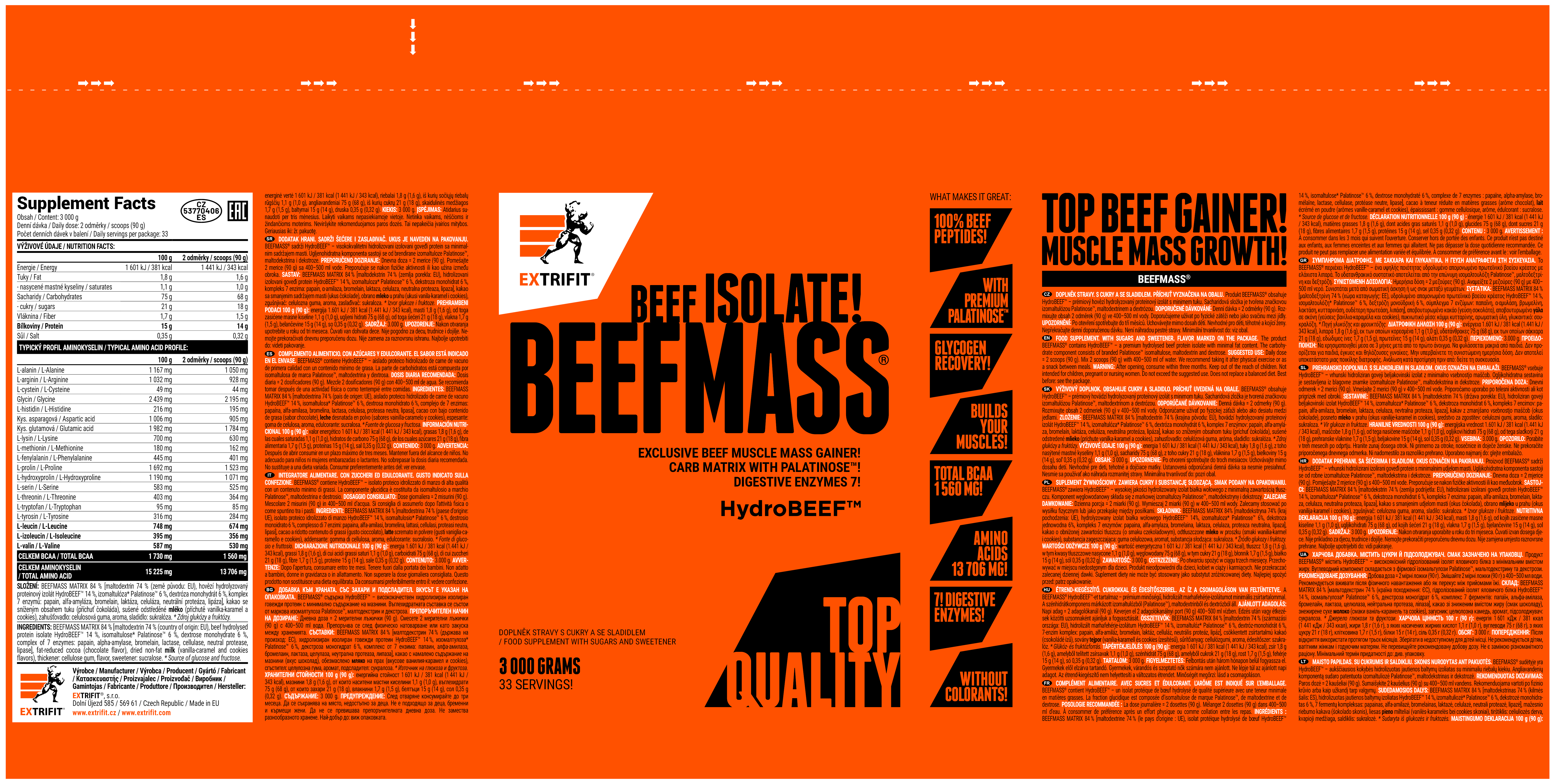Sacharidová složka produktu BeefMass je tvořena trojkombinací sacharidů s efektem postupného uvolňování glukózových jednotek: středně rychlým maltodextrinem, rychlou dextrózou a pomalou palatinózou (izomaltulózou), sacharidem s nízkým glykemickým indexem. Využití bílkovin gaineru BeefMass ve firmě Extrifit podpořili přírodními enzymy bromelainem a papainem u čokoládové příchuti a 7 enzymy u dalších příchutí. Všechny příchutě chutnají excelentně. Extrifit přichází na trh se zcela novou řadou produktů obsahujících značkový hydrolyzovaný hovězí proteinový izolát HydroBEEF®! Suplementy s hovězím proteinovým izolátem: vše, co byste měli vědět! Určitě jste si všimli nové řady produktů sportovní výživy, které obsahují značkový hovězí proteinový izolát HydroBEEF® (hydrolyzované hovězí peptidy). V následujícím textu Vám přinášíme odpovědi na nejčastější otázky spojené s těmito špičkovými suplementy. Jak probíhá technologický proces sprejového sušení při výrobě hovězího proteinového izolátu? Tento proces probíhá za přesně stanovené stabilní teploty a vlhkosti, která je udržována vysoce výkonným a speciálním odvlhčovačem vzduchu. Po průchodu tryskami, které vytvářejí sprejový efekt ve fluidní a rozprachové sušárně za pomoci silné odstředivé síly, je pak proteinový vývar zbaven vody. Vzniká tak zcela suchý, nelepivý prášek, který se nazývá sprejově sušený vývar. Tento je poté hydrolyzován (rozštěpen na peptidy) a vzniká špičkově stravitelný a využitelný HydroBEEF®. Jaké jsou nutriční hodnoty sprejově sušeného hovězího izolátu v řadě BEEF Extrifit? Tento čistě přírodní hydrolyzovaný proteinový izolát má zachovány veškeré hodnotné látky. Kvalitu hovězí bílkoviny, vitamíny i minerální látky. Finální surovina v suplementu obsahuje 97 % bílkovin, pouze 1,9 % tuku a 0 % cukrů. Tento 97% hovězí proteinový izolát je tak ideálním doplňkem výživy v kulturistice, kdy jeho suplementací získáváte naštěpené izolované bílkoviny pro růst svalové hmoty a přitom nekonzumujete téměř žádný tuk. Mají tyto vlastnosti: