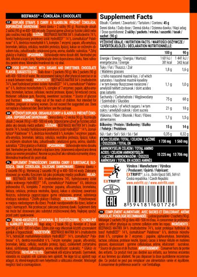 Sacharidová složka produktu BeefMass je tvořena trojkombinací sacharidů s efektem postupného uvolňování glukózových jednotek: středně rychlým maltodextrinem, rychlou dextrózou a pomalou palatinózou (izomaltulózou), sacharidem s nízkým glykemickým indexem. Využití bílkovin gaineru BeefMass ve firmě Extrifit podpořili přírodními enzymy bromelainem a papainem u čokoládové příchuti a 7 enzymy u dalších příchutí. Všechny příchutě chutnají excelentně. Extrifit přichází na trh se zcela novou řadou produktů obsahujících značkový hydrolyzovaný hovězí proteinový izolát HydroBEEF®! Suplementy s hovězím proteinovým izolátem: vše, co byste měli vědět! Určitě jste si všimli nové řady produktů sportovní výživy, které obsahují značkový hovězí proteinový izolát HydroBEEF® (hydrolyzované hovězí peptidy). V následujícím textu Vám přinášíme odpovědi na nejčastější otázky spojené s těmito špičkovými suplementy. Jak probíhá technologický proces sprejového sušení při výrobě hovězího proteinového izolátu? Tento proces probíhá za přesně stanovené stabilní teploty a vlhkosti, která je udržována vysoce výkonným a speciálním odvlhčovačem vzduchu. Po průchodu tryskami, které vytvářejí sprejový efekt ve fluidní a rozprachové sušárně za pomoci silné odstředivé síly, je pak proteinový vývar zbaven vody. Vzniká tak zcela suchý, nelepivý prášek, který se nazývá sprejově sušený vývar. Tento je poté hydrolyzován (rozštěpen na peptidy) a vzniká špičkově stravitelný a využitelný HydroBEEF®. Jaké jsou nutriční hodnoty sprejově sušeného hovězího izolátu v řadě BEEF Extrifit? Tento čistě přírodní hydrolyzovaný proteinový izolát má zachovány veškeré hodnotné látky. Kvalitu hovězí bílkoviny, vitamíny i minerální látky. Finální surovina v suplementu obsahuje 97 % bílkovin, pouze 1,9 % tuku a 0 % cukrů. Tento 97% hovězí proteinový izolát je tak ideálním doplňkem výživy v kulturistice, kdy jeho suplementací získáváte naštěpené izolované bílkoviny pro růst svalové hmoty a přitom nekonzumujete téměř žádný tuk. Mají tyto vlastnosti: