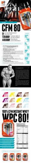 nejkvalitnější zdroj bílkovin – nativní CFM instantní syrovátkový koncentrát vyrobený v Evropské unii protein je zpracován nejšetrnější metodou za studena na keramických mikrofiltrech zachovány všechny důležité bílkovinné frakce (žádné ničení bílkoviny chemií nebo ionty) přidáno 7 silných trávicích enzymů pro dokonalé využití bílkovin a hladké strávení obsažených živin slazen kombinací ověřené sukralózy a steviol-glykosidů přírodního původu z rostliny stévie ovocné příchutě obsahují rozemleté kousíčky 100% ovoce pro ještě lepší chuť plná krémovitost a lahodná konzistence používá pouze a jen přírodní barviva, žádná syntetika 13 naprosto excelentních příchutí, vylepšené na samou hranici možného pro tento typ CFM proteinu 100% instantní – zcela dokonale rozpuštěn za několik sekund špičková stravitelnost a využitelnost bílkovin zcela bezprašný – jemně nadýchaná konzistence určen pro nárůst kvalitní svalové hmoty díky skvělým nutričním hodnotám vhodný také do diety dóza je zatavena v celoplošném sleevu až po víčko – máte jistotu, že právě Vy jste úplně první, kdo protein otevřel pod víčkem indukčně zatavená zátka pro zamezení vstupu vzduchu do produktu Obrovským benefitem je zachování všech bílkovinných frakcí (podívejte se ve složení níže na podrobný rozpis). Navíc jsme přidali komplex sedmi enzymů pro dokonalé strávení proteinu a zabudování bílkovin do svalové hmoty. Jedná se o enzymy papain, alfa-amyláza, bromelain, laktáza, celuláza, neutrální proteáza a lipáza. Kombinace sukralózy a sladidla přírodního původu z rostliny stévie vytváří dokonale vyváženou sladkou chuť! CFM Instant Whey 80 Vám nabízíme ve 13 vynikajících příchutích. V ovocných variantách je obsaženo pravé, sušené ovoce (tedy žádná chemie) a na chuti je to obrovsky znát! Troufáme si tvrdit, že protein CFM Instant Whey 80 chutná nejlépe ze všech. Chuť je plná, výrazná a nápoj nádherně krémový. Obsah proteinu je pro tento typ produktu nadstandardních 75 %! Kromě skvělého složení je tento výrobek oblíben díky snadné a bezproblémové přípravě – je výborně rozpustný, nepráší a netvoří hrudky. O použitém nativním CFM proteinu: CFM je přírodní, nechemický proces výroby syrovátkového proteinu nejvyšší kvality, filtrovaného na speciálním, technologicky vyspělém keramickém cross-flow filtru, který je schopen ve vysoké míře odfiltrovat všechny nežádoucí složky (jako je tuk, laktóza…) a izolovat čistou (panenskou) syrovátkovou bílkovinu se zachováním všech cenných mikrofrakcí, jako je beta-laktoglobulin, alfa-laktalbumin, sérový albumin, imunoglobulin, glykomakropeptidy a laktoferin. To vše bez použití chemikálií či rozpouštědel. CFM je nejšetrnější existující metoda výroby bílkovin, protože surovina není vystavena žádným znehodnocujícím postupům, např. vysokému tlaku, teplotě, iontům či hydroxidům. Pouze samovolně prochází svojí vlastní vahou přes keramické filtry. Díky tomu je finální syrovátkový protein intaktní = nedotčený ničím a nikým = tzv. panenský protein (virgin protein). Jeho struktura, složení bílkovin, vůně, barva a chuť je přirozená, ničím neovlivněná a nezměněná, zůstává v původní, tzv. nativní podobě.