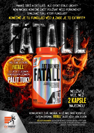! Obsahuje kofein, není vhodné pro děti a těhotné ženy. Denní dávka obsahuje 244,4 mg kofeinu ve 3 kapslích, 407,4 mg kofeinu v 5 kapslích. Produkt není vhodný pro osoby trpící přecitlivělostí na kofein. Takto komplexní spalovač tuku nemá na trhu obdoby a je vůbec nejúčinnějším výrobkem v kategorii spalovačů tuku. Produkt Fatall® Ultimate Fat Burner je sestaven speciálně tak, aby podporoval nejen spalování tuku, ale abyste se v průběhu redukčního programu necítili unaveni a aby redukční dieta nesnižovala Váš tělesný výkon ani mentální výkon a neovlivňovala negativně Vaši náladu. Fatall® Ultimate Fat Burner je v kapslované formě. Díky ní je výborně stravitelný. Kapsle neobsahují žádná pojiva jako některé tablety, kvůli nimž se účinné látky dlouho a špatně tráví. Pro efektní spalování tuku potřebujete, aby se účinné látky dostaly do krevního oběhu rychle a začaly účinkovat v tu správnou chvíli. A proto je kapslovaná forma tou nejvhodnější volbou. Kapsle je potištěna logem Extrifit® a barvivo potisku je přírodní. Některé z 18 účinných látek: