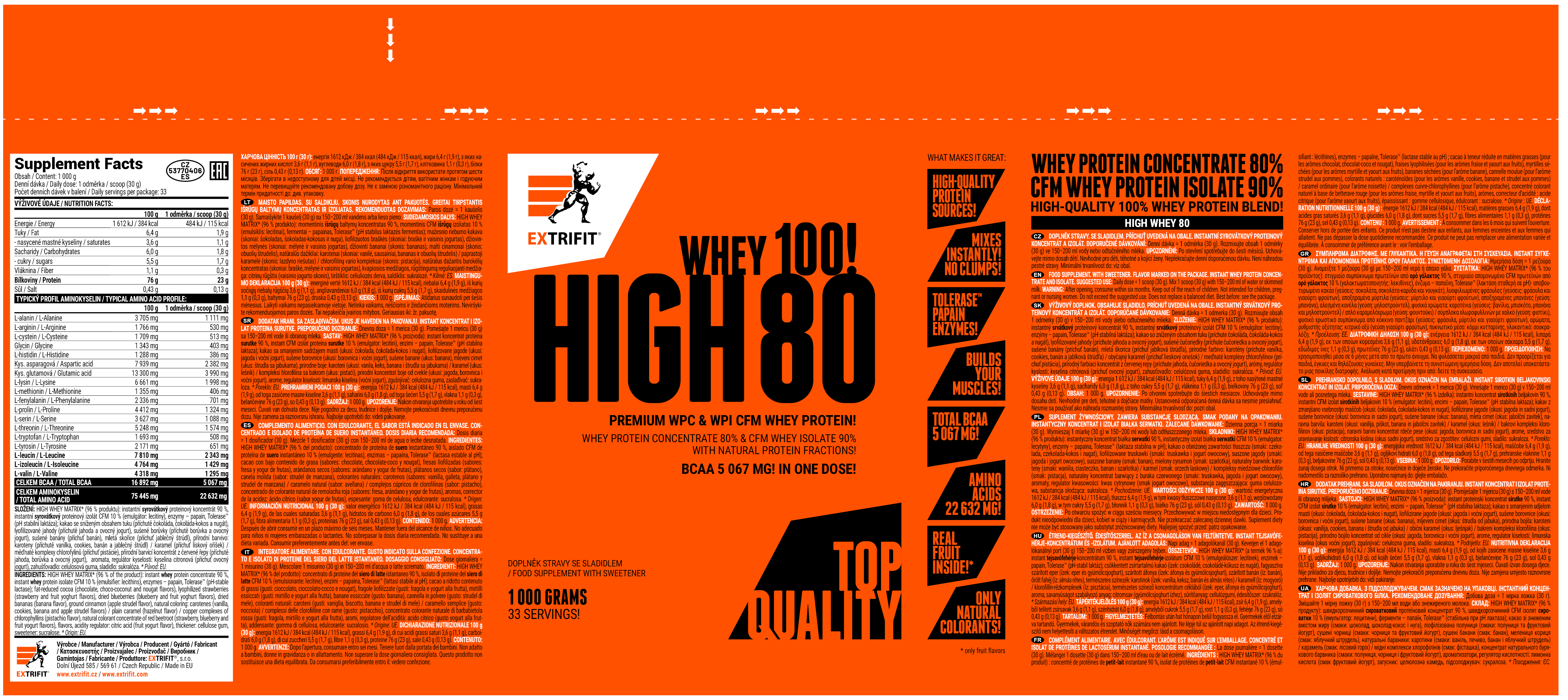 High Whey 80 je naprosto nový výrobek od Extrifitu! Proteinové výrobky a gainery jsou specializací firmy Extrifit. Neustále zdokonalují jejich složení a vyvíjí nové receptury s využitím stále lepších a modernějších surovin. High Whey je špičkový 100 % syrovátkový proteinový koncentrát a CFM proteinový izolát pro nárůst svalové hmoty! Kombinace dvou proteinových zdrojů - syrovátkový proteinový koncentrát a CFM proteinový izolát - Vám přinese výhody obou z nich - neuvěřitelně lahodnou chuť, výbornou konzistenci, skvělé zastoupení živin, velmi dobrou stravitelnost a to vše za super výhodnou cenu! Proteiny obsažené v High Whey 80 jsou doplněny o enzymy papain a Tolerase (pH stabilní laktázu). Příjem toho vysoce kvalitního zdroje proteinu přispívá k růstu svalové hmoty a k jejímu udržení v situacích, kdy je ohrožena katabolizací.