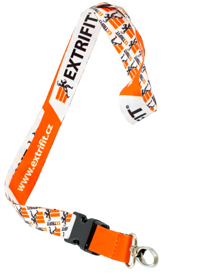 jedna strana - střídající se pruhy oranžové a bílé s nápisem Extrifit a webovými stránkami druhá strana - bílý podklad s menšími logy Extrifit mezi sponou a karabinou oranžová Černo-oranžová