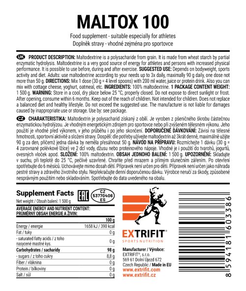 není sladký je okamžitě rozpustný díky aglomerizaci je vynikajícím zdrojem sacharidů pro sportovce a pro osoby při zvýšené tělesné zátěži Extrifit® Maltox 100 nepochází z Číny. Pšenice (surovina pro výrobu maltodextrinu) je vypěstována v zemích Evropské unie. Doporučené dávkování: