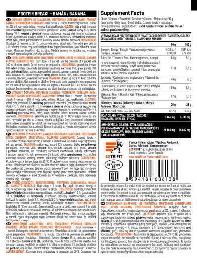 Příprava za studena: Stačí přidat vodu nebo mléko a za chvíli máte hotovo! Vysoký obsah kvalitních bílkovin: Hlavním zdrojem je oblíbený 80% syrovátkový koncentrát, ideální pro maximální podporu regenerace, růstu a ochrany svalů. Nutriční profil bez kompromisů: Hromada BCAA, kopec plnohodnotných bílkovin a komplexní sacharidy z rýže, ovsa a pšenice pro stabilní přísun energie. Dokonalé křupání: Kombinace obilných křupek a exkluzivních proteinových kuliček tvořené výhradně z 90% syrovátkového izolátu a rýže vás pohltí hned po prvním soustu! Lyofilizované ovoce: Na ovocné příchutě jsme použili až 432 g čerstvých plodů (platí pro velké balení)! Díky lyofilizaci si ovoce zachovává přirozenou chuť, vůni a zdraví prospěšné látky. Prvotřídní suroviny, vynikající chuť: Jemně strouhaný kokos, pravá skořice, vanilka nebo hobliny z hořké čokolády. Vyberte si ze široké škály vyladěných příchutí. Inulin pro zdravé trávení: Podpora střevní rovnováhy díky prebiotickému účinku. Praktické sáčky na cesty Produkt je dostupný nejen v klasickém balení, ale také v jednorázových sáčcích. Každou porci si tak můžete vychutnat v jiné příchuti, což přináší vítanou rozmanitost. Sáčky jsou ideální na cesty, do práce nebo do fitka – stačí je hodit do tašky a máte zdravé jídlo kdykoliv po ruce. Dieta bez kompromisů Protein Break! je ideální volba pro ty, kdo chtějí shodit přebytečné tuky. Díky vyváženému složení vytvoříte pro tělo ty nejlepší podmínky – kvalitní bílkoviny pro ochranu svalů, dostatek BCAA a komplexní sacharidy s vlákninou pro stabilní energii bez výkyvů. Výhody na první pohled: