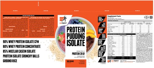 Protein Pudding Isolate – lahodný fitness pudink bez nutnosti vaření! Milujete pudink, ale nemáte čas na vaření a hromadu nádobí? Protein Pudding Isolate připravíte za dvě minuty jen s vodou nebo mlékem! Ideální volba pro zdravou proteinovou svačinu doma, v kanceláři i na cestách. Každá porce obsahuje 20 g vysoce kvalitních bílkovin z 90% CFM syrovátkového izolátu, 85% izolátu micelárního kaseinu a 80% syrovátkového koncentrátu. Tento jedinečný proteinový komplex podpoří regeneraci a růst svalů po náročném tréninku. Součástí jsou i delikátní proteinové křupínky bez přidaného cukru, tvořené pouze z rýže a syrovátkového izolátu – pro ještě lepší zážitek z každé porce! Špičkové složení, prémiové suroviny V Extrifitu se zaměřujeme na prvotřídní kvalitu, proto se můžete těšit na prémiové suroviny, které v běžných produktech jen tak nenajdete. A že jsme s jejich množstvím rozhodně nešetřili!
