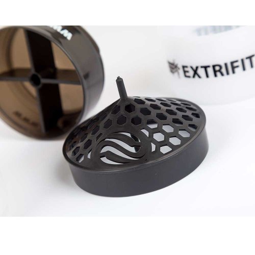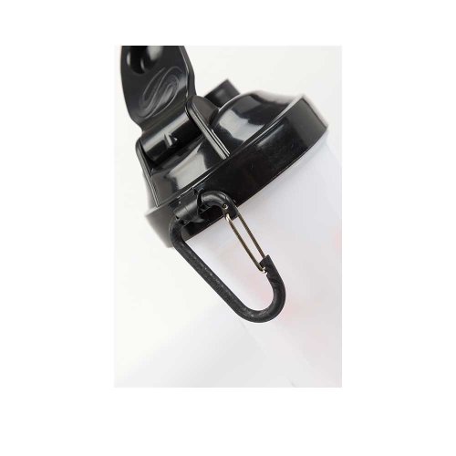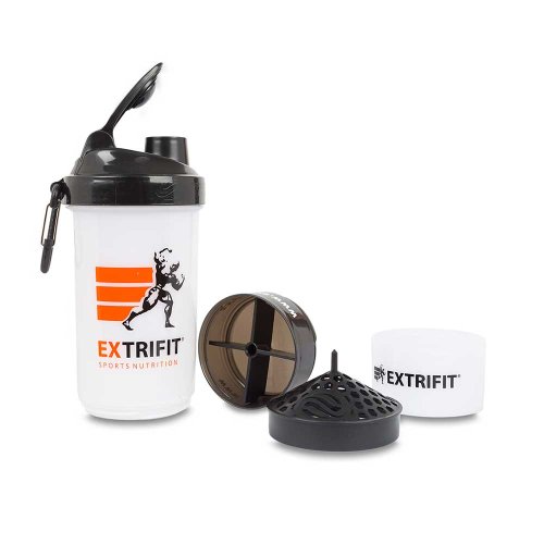 Jeden z odnímatelných zásobníků obsahuje vloženou přihrádku se čtyřmi odděleními na tablety či kapsle, přihrádku lze ale i vyjmout, objem takto získaného prostoru (např. pro odsypání proteinu nebo gaineru) je 150 ml. Druhý (spodní) zásobník má objem dalších 200 ml. Samotný šejkr má stupnici od 100 do 600 ml. BPA a DEHP free.