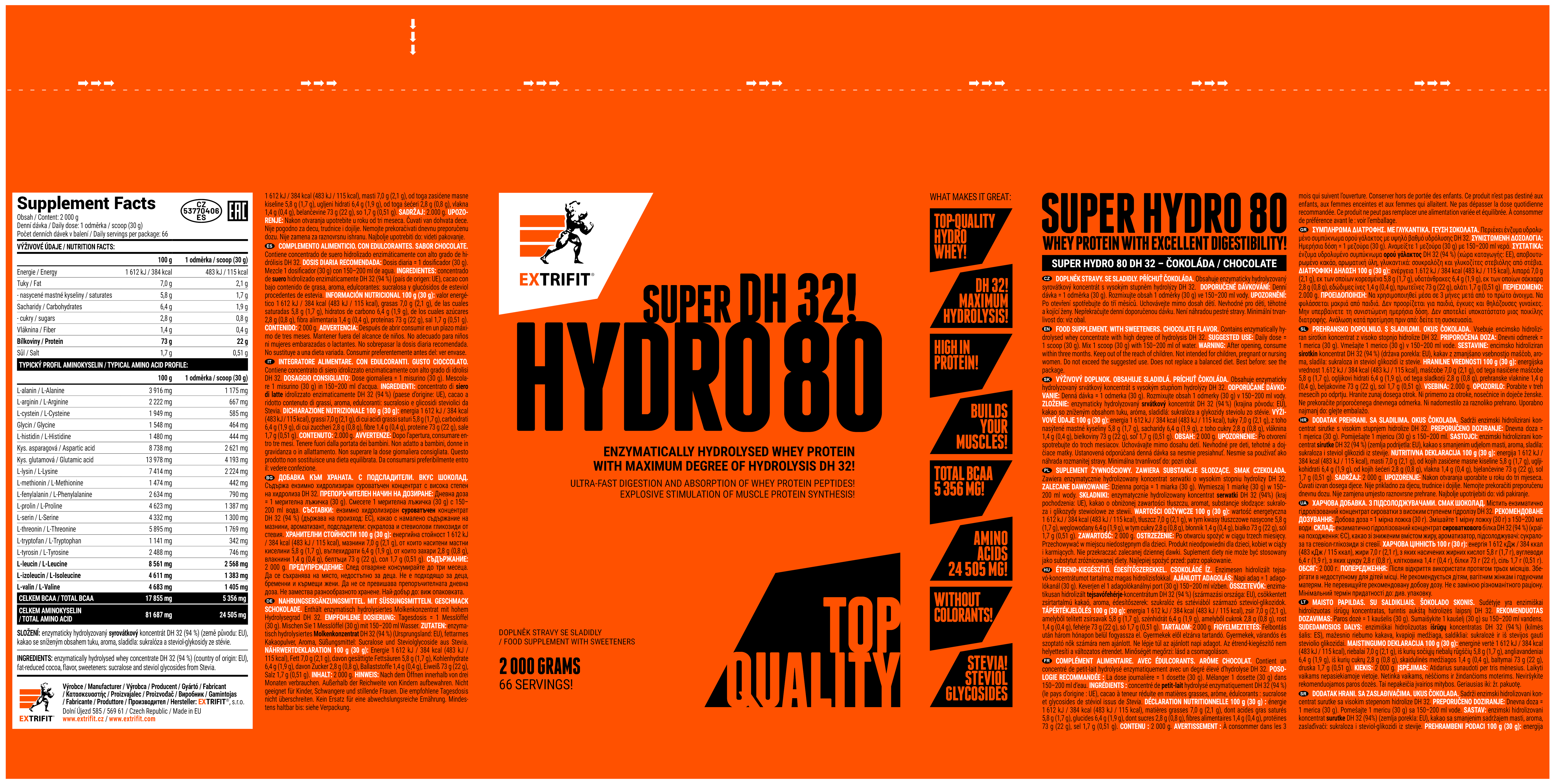 Oproti jiným proteinovým přípravkům vyniká Super Hydro 80 DH32 vysokým obsahem krátkých peptidů (průměrná molekulární hmotnost 1,6 kilodaltonů), takže jej můžete konzumovat po tréninku, popř. i před ním. Příjem toho vysoce kvalitního zdroje proteinu přispívá k růstu svalové hmoty a k jejímu udržení v situacích, kdy je ohrožena katabolizací. Výrobek dodáváme v čokoládové příchuti s typickou hořkostí syrovátkového hydrolyzátu DH32. Určeno pro zvláštní výživu - vhodné pro sportovce a pro osoby při zvýšené tělesné zátěži. Super Hydro DH32 má typickou hořkokyselou chuť, kterou není možné srovnávat s chutí jakéhokoli jiného proteinu! Upozorňujeme důrazně na tuto specifickou vlastnost produktu Super Hydro DH32, která je způsobena mimořádně vysokým stupněm hydrolyzace syrovátkového proteinu!
