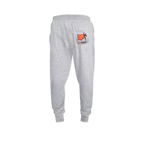 Pohodlné tepláky firmy Extrifit s výšivkou a potiskem. Šedá barva s oranžovými tkaničkami pro stažení v pase.