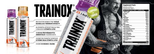 ! Obsahuje kofein, není vhodné pro děti a těhotné ženy. Denní dávka (1 shot) obsahuje 310 mg kofeinu. Produkt není vhodný pro osoby trpící přecitlivělostí na kofein. TRAINOX® je doplněk stravy určený pro totální maximalizaci tréninkové intenzity. Jedná se o multikomponentní produkt obsahující zcela novou a brutálně silnou směs účinných látek určených pro předtréninkové použití. Znáte AGREZZ®? Evropský hit a bestseller mezi pre-workouty? Máte ho v oblibě? Tak TRAINOX® si zamilujete také. Ještě silnější složení a díky jednorázovým shotům připraveno rovnou ke konzumaci! Tekutá forma produktu navíc zajišťuje rychlou a výbornou vstřebatelnost. Účinky každé dávky pre-workoutu TRAINOX®: