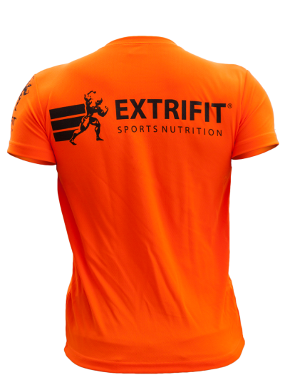 Pohodlné neonově oranžové triko firmy Extrifit s oboustranným černým potiskem, krátký rukáv, kulatý výstřih s překladem. Vyrobeno je z příjemného, vzdušného a pružného materiálu a na přední i zadní straně a jednom rukávu má potisk - černé logo Extrifit. Materiál: