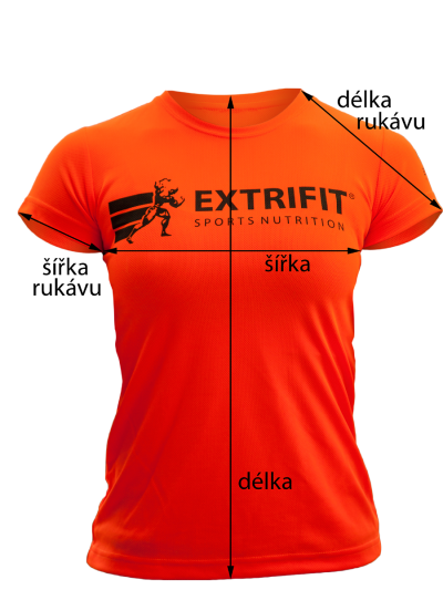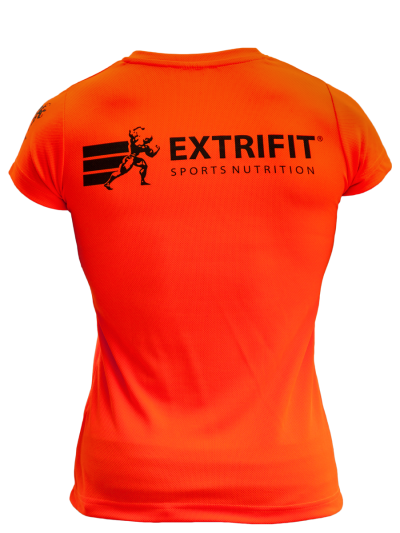 Pohodlné neonově oranžové triko firmy Extrifit s oboustranným černým potiskem, krátký rukáv, kulatý výstřih.