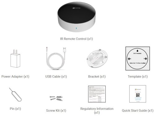 EZVIZ T33; Univerzální IR dálkový ovladač, který umožňuje snadné ovládání domácích infračervených zařízení , jako jsou například televize a klimatizace, prostřednictvím mobilní aplikace .
