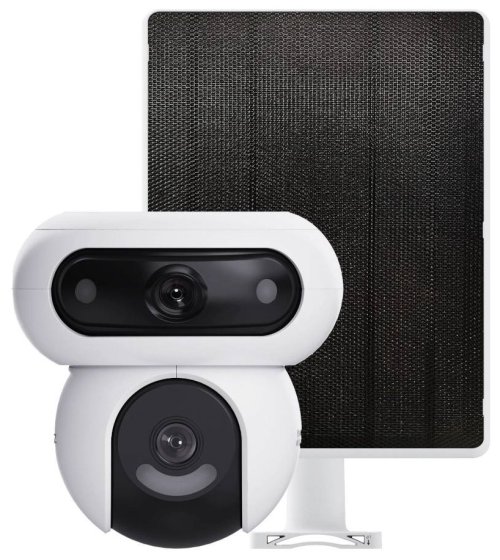 Venkovní otočná IP kamera s duálním snímačem je navržena pro sledování venkovních prostor ve vysokém rozlišení obrazu 2K+ při 15 fps. Konstrukce se dvěma objektivy zajišťuje komplexní pokrytí velkých prostor. Pro nahrávání zřetelného videa i v naprosté tmě disponuje nočním režimem s IR přísvitem do vzdálenosti až 35 m a také bílým LED přísvitem pro barevné záběry v noci. Komprese H.265/H.264 snižuje nároky na přenos dat a úložiště. Natočené záznamy je možné ukládat na microSD kartu do kapacity až 512 GB, nebo odesílat na cloudové úložiště (na základě předplatného). Součástí kamery je integrovaný reproduktor a mikrofon, který umožní kvalitní oboustrannou komunikaci. Aktivní zastrašení v podobě stroboskopického světla a zvukového alarmu pak varuje případné narušitele. Propojení kamery pomocí aplikace v mobilním zařízení umožní pohodlný vzdálený přístup, pořizování záznamů či fotografií nebo upozornění v případě detekce pohybu. Mezi další užitečné funkce patří například rozpoznávání lidské postavy a vozidla pomocí umělé inteligence, přizpůsobitelná oblast detekce pohybu či sledování pohybující se postavy (Auto-Tracking). Připojení lze jednoduše realizovat bezdrátově skrze Wi-Fi. Je kompatibilní s inteligentními hlasovými asistenty Amazon Alexa a Google Assistant. Díky voděodolnému krytu dle IP65 nabízí jak vnitřní, tak i venkovní možnost použití. Napájení zajišťuje vestavěná baterie s kapacitou 10 400 mAh, kterou je možné napájet také pomocí solárního panelu (součástí balení).