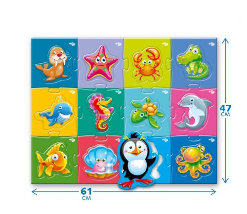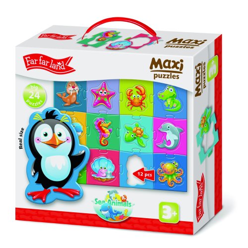Far Far Land Maxi Puzzle mořská zvířátka. Balení obsahuje 24 dílků (12 puzzle dílků + 12 dílků se zvířátky). Složené 61x47 cm.
