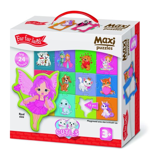 Far Far Land Maxi Puzzle roztomilé postavičky. Balení obsahuje 24 dílků (12 puzzle dílků + 12 dílků s postavičkami). Složené 61x47 cm.
