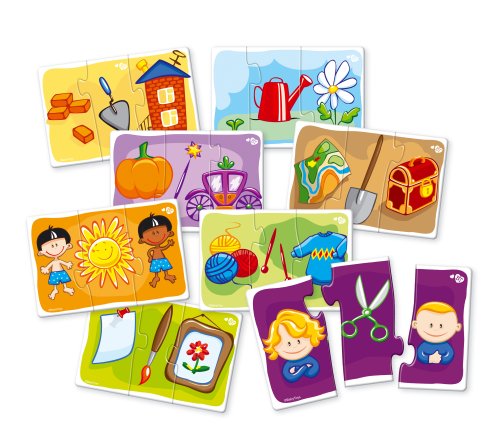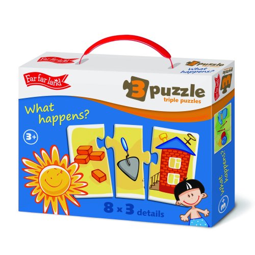 Far Far Land Puzzle činnosti trojice. Balení obsahuje 8 puzzle obrázků, které se skládají ze 3 dílků (vyobrazují trojice k sobě patřících předmětů).