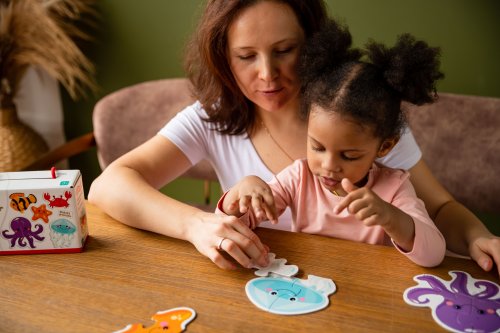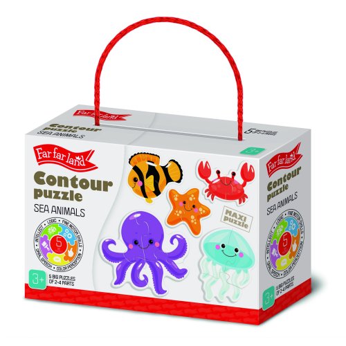 Puzzle obrysové pro děti, motiv mořská zvířátka. Balení obsahuje 5 puzzle obrázků, které se skládají ze 2 - 4 dílků.
