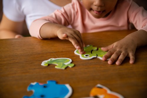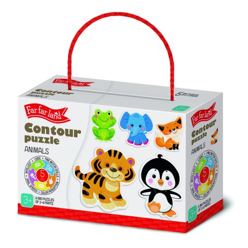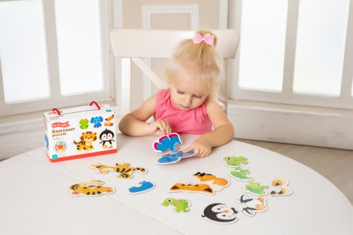 Puzzle obrysové pro děti, motiv zvířátka. Balení obsahuje 5 puzzle obrázků, které se skládají ze 2 až 4 dílků.