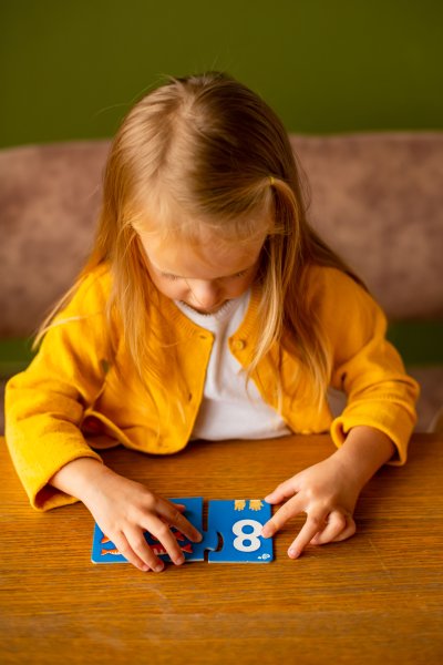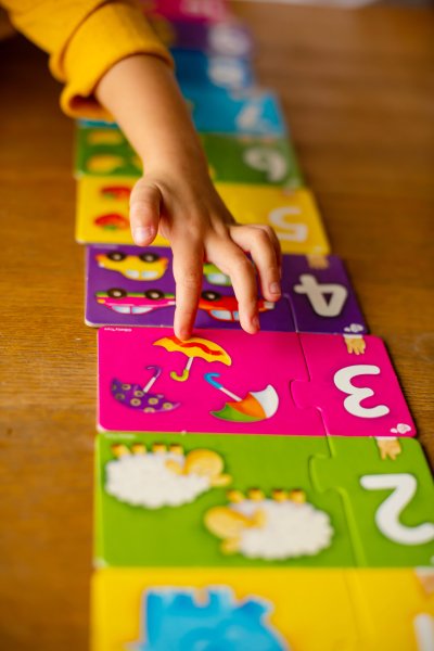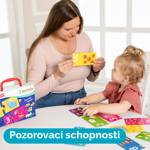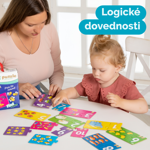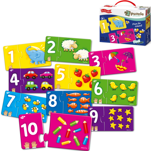 Far Far Land Puzzle párovací. Balení obsahuje 10 puzzle obrázků. Počítání do deseti - každý puzzle obrázek se skládá ze dvou dílků (číslo a obrázek).