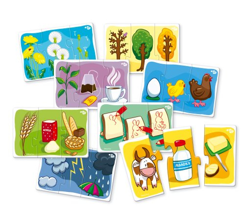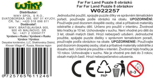 Far Far Land Puzzle trojice. Balení obsahuje 8 puzzle obrázků, které se skládají ze 3 dílků (vyobrazují trojice k sobě patřících předmětů).