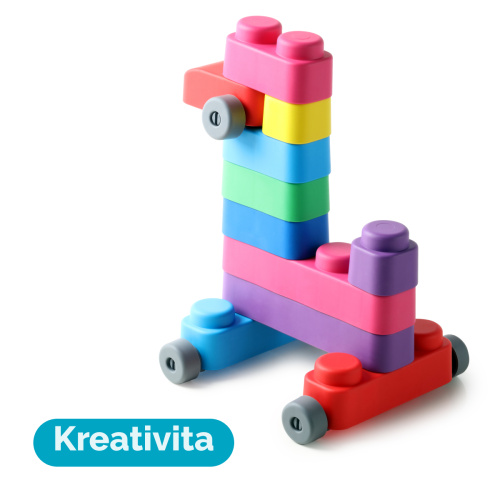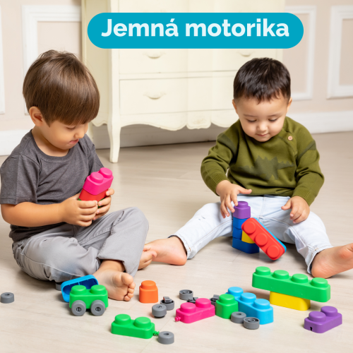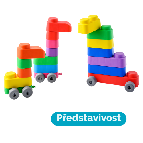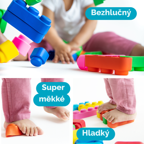 Far Far Land Stavebnice měkká. Všechny bloky jsou vyrobeny z měkkého bezpečného materiálu. Balení obsahuje 15 bloků a 12 koleček.