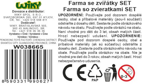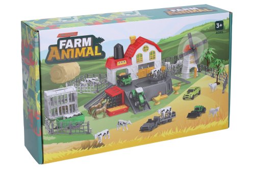 Farma se zvířátky. Součástí vše z obrázků na obalu - farma, mlýn, traktor s vlečkou, sklápěč, nakladač, přepravní vozidlo, ohrada, stromy, figurky zvířátek (koně, slepice, ovce, kozy, pes). Obrázkový návod na složení na zadní straně obalu.