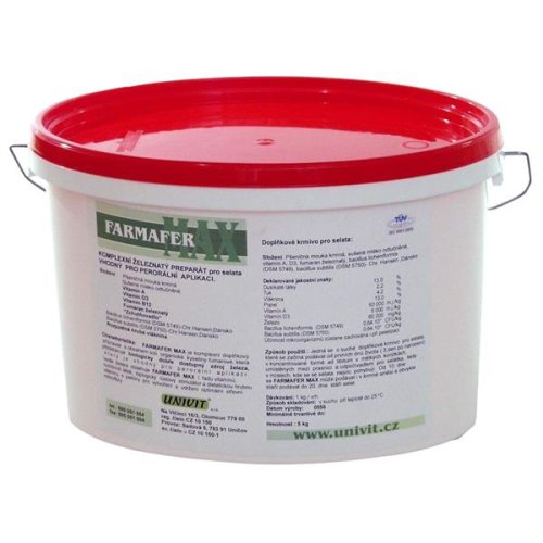 FARMAFER MAX je schválený veterinární přípravek, jedná se o komplexní přípravek s obsahem vitamínů, užitečných mikroorganismů a organicky vázaného železa, které slouží jako biologicky dobře dostupný zdroj železa vhodný na perorální aplikaci. Soustavný příjem resorbovatelného železa doplňuje denní deficit, vzniklý zvláště při jeho nedostatku v mateřském mléce a udržuje tak hladinu červené krevní složky na fyziologické hladině.