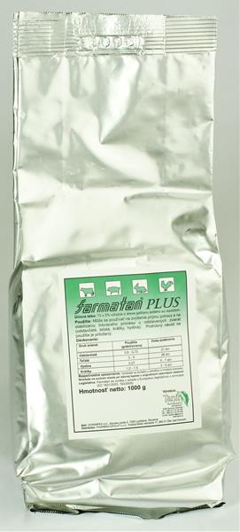 Přípravek na akutní střevní katary a s nimi spojené průjmy, infekční průjmy mláďat. Složení: 100 gramů přípravku obsahuje přibližně 74g taninu – výtažku z dřeva kaštanu jedlého a sladidlo. Tanin působí adstringentně na povrch střevní sliznice, váže bílkoviny a ve styku se sliznicí střeva tvoří na povrchu tenký povlak nerozpustných bílkovin. Tento povlak chrání sliznici střeva před podrážděním, zabraňuje vstřebávání škodlivých látek a zmírňuje peristaltiku střeva. Snižuje množství do střev vylučované tekutiny a tím redukuje dehydrataci organismu. Tanin také koaguluje krevní bílkoviny, čímž snižuje krvácení. Může se používat na zvýšení příjmu potravy při současném omezení vysoké spotřeby a na stabilizaci trávicího procesu u odstavených zvířat (odstávčata, telata, králíky, drůbež). Dávkování: FARMATAN PLUS lze podávat přímo v čerstvém nebo konzervovaném krmivu jako kompletní krmná směs nebo jako přídavek do krmiva. Odstávčata 3-5kg / t krmiva, po dobu 21 dní, začít 5 dní před odstavem. Prasata 3-5kg / t krmiva, po dobu 10dní. S přidáváním začít 5 dnů před objevením se průjmu. Telata 20-40 g (1-2) lžíce denně 3-4dní, podávat s vodou. Skot 40-160g (2-8lžic) denně 3-4dní podávat s vodou. Dávku rozdělit na dva díly. Drůbež 0,5 kg / t krmiva pro bojlery prvních 7dní a 1kg / t krmiva posledních 5 dnů odchovu. Nebo 1 kávovou lžičku na 10 zvířat během 5-7dní. Králíci 0,75 g / kus / den rozpustit ve vodě, v krmivu, 2-3 týdny po odstavení.