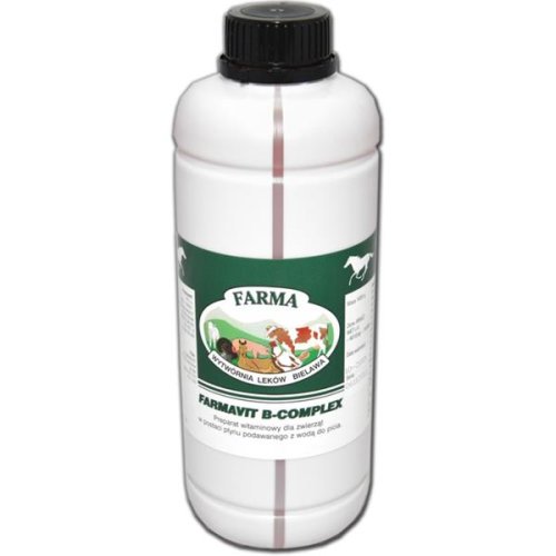 Vitaminový přípravek pro zvířata v podobě roztoku podávaného s pitnou vodou. Premix vitaminů. Vlastnosti: Přípravek obsahuje komplex vitaminů skupiny B. Vitaminy z této skupiny hrají velmi důležitou roli při metabolizmu sacharidů, tuků a bílkovin. Jsou také nezbytné pro správnou funkci nervové soustavy, epitelové tkáně a svalů. Doporučení: Při nedostatku vitaminů ze skupiny B, období růstu a vývoje, poruchách nervové soustavy, snížení schopnosti líhnutí, poruchách opeření, kanibalizmu, v době léčby antibiotiky a při různých stresových situacích. Složení: 1 litr obsahuje: vitamin B1 - 200 mg, vitamin B2 - 400 mg, vitamin B5 400 mg (pantothenan vápenatý), vitamin B6 - 200 mg, vitamin B12 - 0,5 mg, vitamin PP - 3 000 mg (amid kyseliny nikotinové), rozpouštědlo - do 1 000 ml. Dávkování a způsob aplikace: Farmavit B-complex se přidává do pitné vody u všech druhů zvířat v množství: Koně, dobytek: 10 ml-20 ml/den/zvíře. Telata, hříbata: 10 ml/den/zvíře. Krmní vepři, březí a kojící prasnice: 15 ml/den/zvíře. Selata, ovce, kozy: 5 ml/den/zvíře. Drůbež: 1-2 ml/1 litr pitné vody