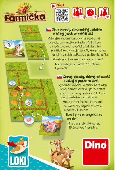 Chytře kombinujte kartičky a vytvořte vlastní farmičku plnou políček kukuřice a ohrádek se zvířátky. A pozor na vlka! Skvělá první strategická hra pro 2–4 hráčů od 6 let.
