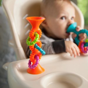 Pestrobarevné silikonové kousátko, které chrastí a určitě zaujme malé děti.