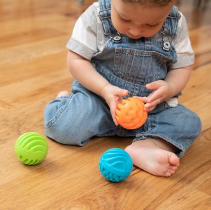 Fat Brain Hmatové míčky Sensory Rollers. Balení obsahuje 3 míčky. Každý z nich má unikátní tvar a texturu. Každý míček má 2 textury, celkem 6 textur. Míčky cinkají. Pro rozvoj hmatového vnímání dítěte. Nezávadné, vyrobeno s kvalitního silikonu, odolný a vhodný pro kousání.