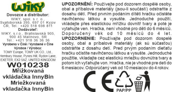 InnyBin mřížkovaná vkládačka. Rám kostky je z plastu. Mřížku tvoří elastické provázky. Různě tvarované kostky z měkkého materiálu lze jednoduše prostrkávat skrz mřížku.