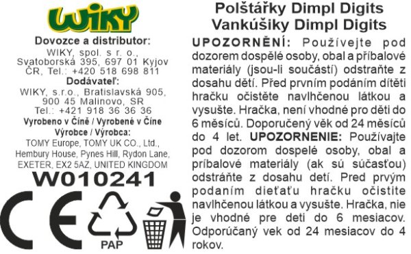Dimpl digits - mačkací polštářky s čísly. Na horní straně číslice a číslo v anglickém jazyce, na spodní straně tečky v počtu odpovídajícím číslici. Vyrobeno z nezávadného silikonu. rozvíjí hrubou motoriku snadný úchop podporuje správný vývoj koordinace „oko-ruka“ zdravý psychomotorický rozvoj Doporučený věk: od narození
