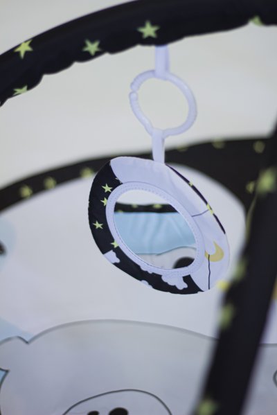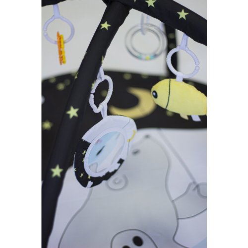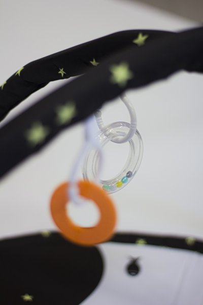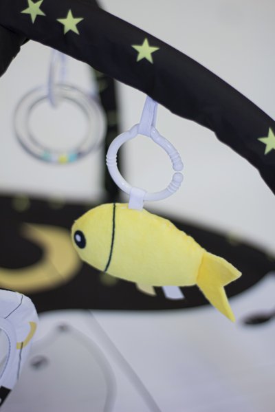 Deka má velkou hrací plochu a 4 samostatné hračky, které jsou součástí balení. Děťátko ležící na bříšku může objevovat hračky zavěšené na hrazdičce pomocí C-kroužků.