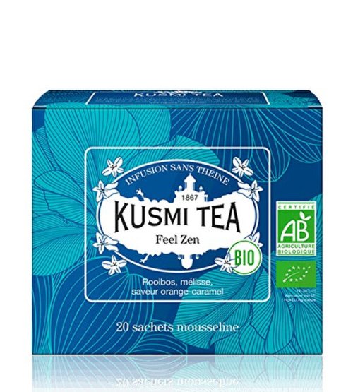 Feel Zen je BIO organický bezkofeinový bylinný čaj od Kusmi Tea s relaxačními účinky připravený z rooibosu se sladkou příchutí jablek, meduňky, listů moruše s osvěžující vůní pomerančů a omamnou vůní karamelu.