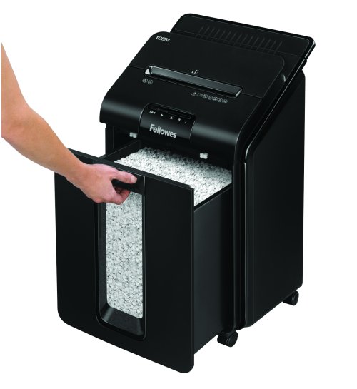Vstupní model z řady automatických skartovačů značky Fellowes. Jen nalož, zapni a běž. Automatický skartovací stroj Vám šetří čas strávený vkládáním skartovaných papírů. Zařízení je schopno na jeden pracovní cyklus při automatickém podávání skartovat až 100 listů 70g papíru v křížovém mikrořezu řezu 4×10 mm. Skartovač je také vybaven vstupní štěrbinou pro ruční podání až 10 listů papíru. Objem odpadního koše 23 litrů. Řezací mechanismus zpracuje při manuálním podávání sešívačkou sešité papíry (až 20 sešitých listů) a kreditní karty. Snadná manipulace se strojem díky pojezdovým kolečkům.