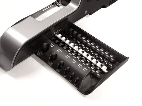 Stroj je vybaven větším zásobníkem na uložení několika plastových hřbetů a integrovanou měrkou pro správnou volbu průměru hřbetu. Na čelní straně stroje je průzor pro snadnou kontrolu zaplnění odpadního prostoru.