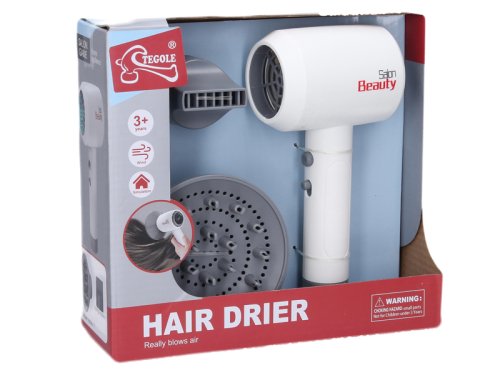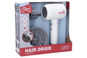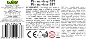 Fén na vlasy. Funkce foukání, dva nástavce, on/off tlačítko a tlačítko bez funkce. baterie 1xAA není součástí. Velikost 18cm