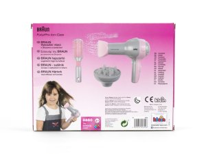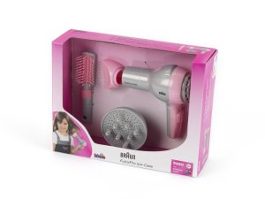 Funkční dětský fén značky Braun s doplňky. Fouká. Baterie 1 x AA, nejsou součástí balení.