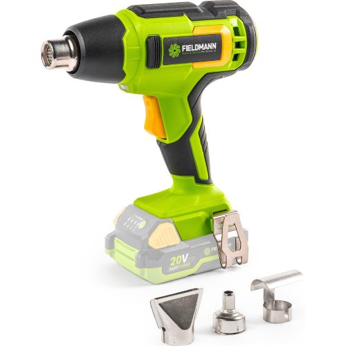 Fieldmann FAST POWER řada 20 V Typ baterie: Li-Ion Kapacita baterie: 1x 20V Ovládání: Elektronické Max. teplota: 500 °C 100 l/min Ergonomická rukojeť: ano Baterie a rychlonabíječka nejsou součástí dodávky