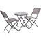 Balkónový set se skládá ze 2ks židlí a stolu Rozměry stolu: 60 x 60 x 71 cm Deska stolu z černého tvrzeného skla Materiál stolu: kovová konstrukce Rozměry židle: 57 x 47 x 76 cm (2 ks v balení) Materiál židle: ocelová konstrukce Výplň židle z odolné umělé textílie Nosnost židle 100 kg Pro venkovní i vnitřní použití Bezúdržbový Přednosti výrobku: snadné skladování (možnost složení)