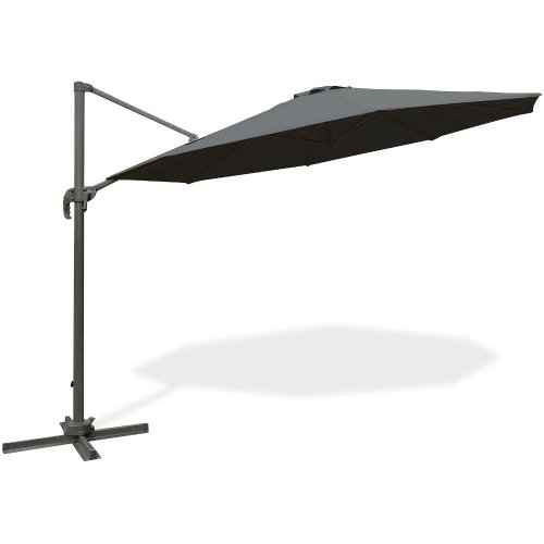Závěsný slunečník o rozměru Ø 3 m Antracitový potah z 100% polyesteru 180 g Materiál: hliník /ocel/polyester 8 ocelových žeber 13 × 22 mm Možnost otočení o 360 ⁰ dle potřeby Možnost nastavení úhlu sklonu Průměr hliníkové tyče 4,8 cm Pro venkovní použití